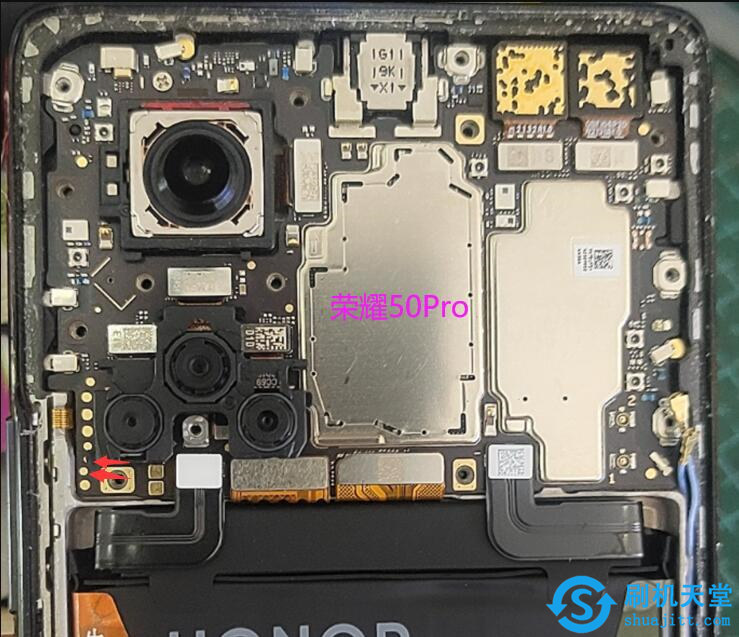 手机后盖有粘胶,在拆之前,可以借助电吹风,对荣耀50pro手机后盖四周吹一下加热软化胶后。配合刀片起个缝隙后慢慢打开后盖。再通过小螺丝刀把主板盖板上的螺丝取掉。打开盖板。就可以看到荣耀50pro手机的9008短接点了。细心耐心一点,非常好拆开的哦。如下图所示: